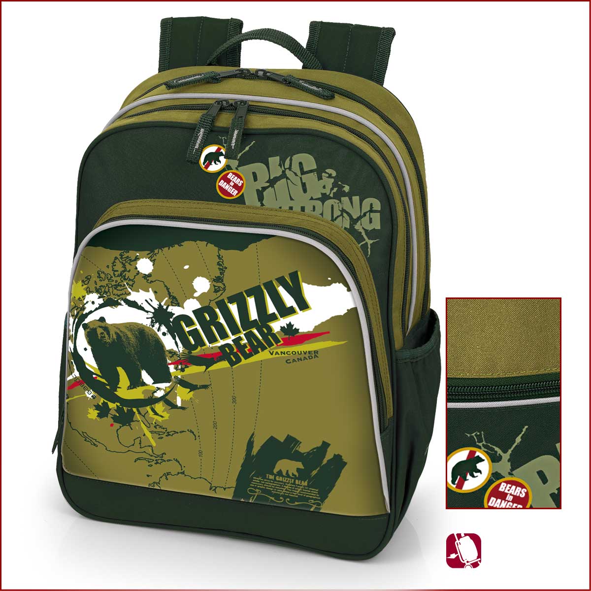 Ученическата раница Grizzly разполага с две основни отделения, един преден джоб и два странични джоба, предназначени за бутилка. Тя е и с удобен ергономичен гръб за по-голямо удобство и улеснение при носенето й. Раницата Grizzly има и система за закрепяне върху количка.