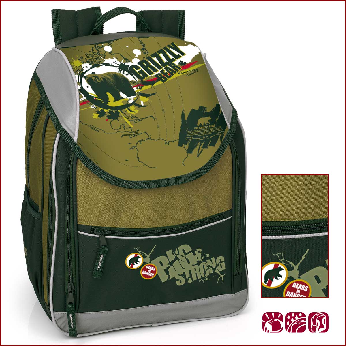 Ученическата раница Grizzly разполага с едно основно отделение, два предни джоба и два странични, предназначени за бутилка. Тя е и с удобен ергономичен гръб за по-голямо удобство и улеснение при носенето й. Раницата Grizzly има и система за закрепяне върху количка.