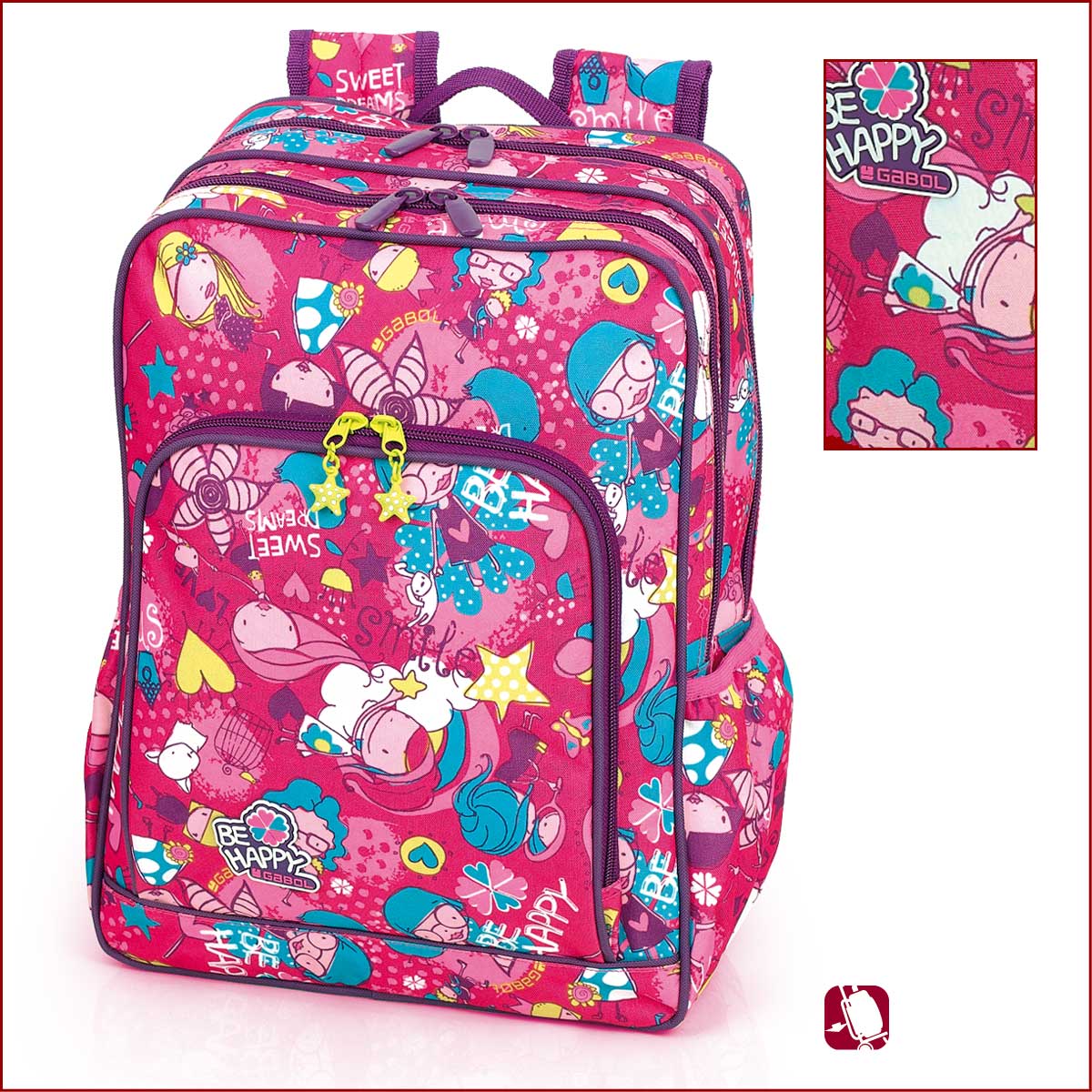 Ученическата раница Happy разполага с две отделения, един голям преден джоб и два странични джоба. Тя е и с термоформ гръб за по-голямо удобство и улеснение на децата при носенето й. Раницата Happy е с една къса дръжка за носене в ръка, както и с две регулируеми презрамки за носене на гръб.