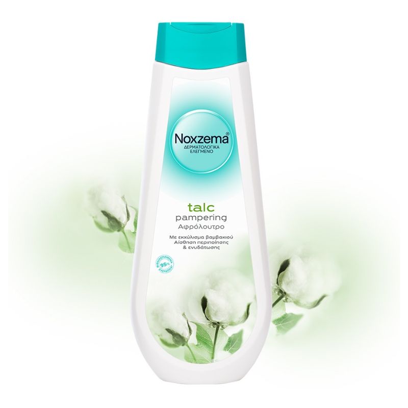 Душ гелът Noxzema Talc Pampering е специално създаден за ефективно почистване на кожата, като в същото време я предпазва и нежно се грижи благодарение на съдържащия се екстракт от памук. Съставът му е обогатен със специалния комплекс от овлажняващи фактори и витамини DERMACARE VITAMIN COMPLEX и ефективно допринася за грижата за кожата, като я поддържа мека и хидратирана. С прекрасен аромат на талк, който освежава и вълнува сетивата! Дерматологично тестван. Идеален за ежедневна употреба от цялото семейство.