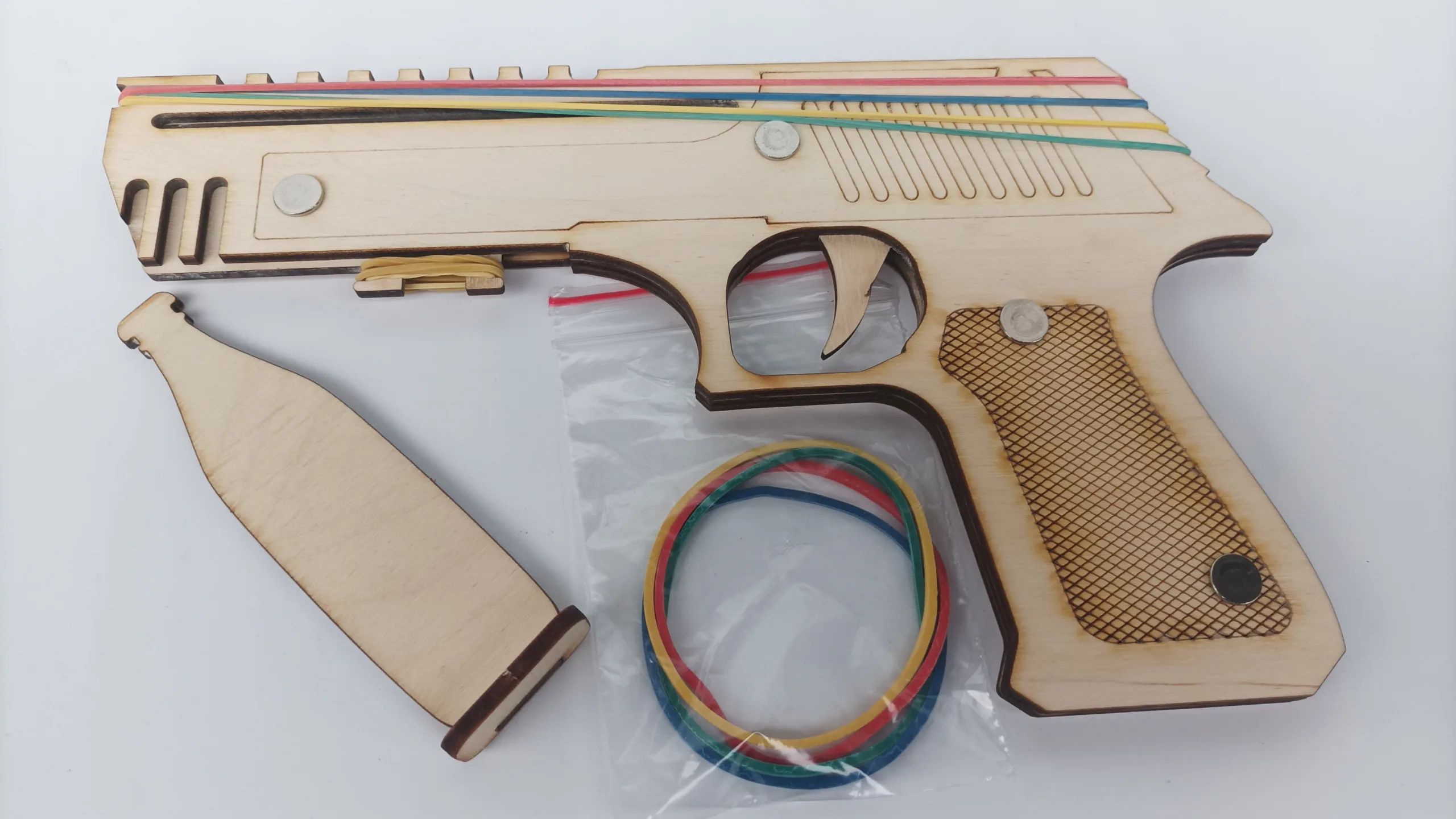 Комплектът Дървен пистолет с мишена играчка съдържа един пистолет, една мишена и два комплекта ластици.