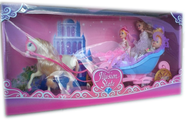 С Каляската с три кукли децата могат изцяло да се потопят в света на приказките, в света на Пепеляшка, в света на Принцеси и Принцове! С тази каляска с кон момиченцата ще могат да възпроизвеждат и надграждат много и различни сцени и истории от приказките обогатени с техните фантазии по въпроса и така да се обогатяват и да реализират част от мечтите си на темата.