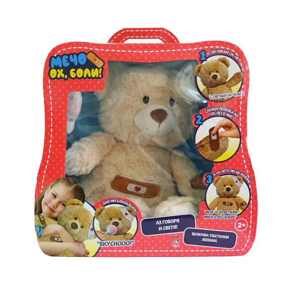 Мечо Ох, боли! говори на български език и ще ти каже как се чувства. Потърси червените светлини на главата, ръчичките, коремчето или крачетата му и сложи лепенка на ох-чето му. Идва и с близалка, за да го нахраниш.