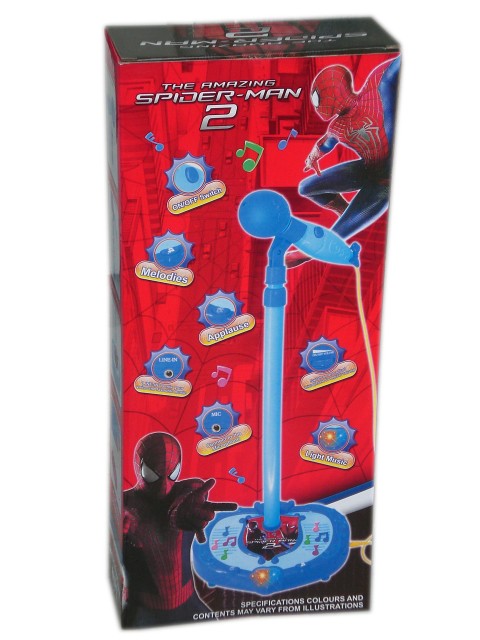 Детска играчка Микрофон на стойка Спайдърмен в основата си има и копче за регулиране височината на звука, светлинни ефекти, други две копчета посредством, които могат да се пускат различни мелодии. В основата има и букса за включване на МР3 -ка.