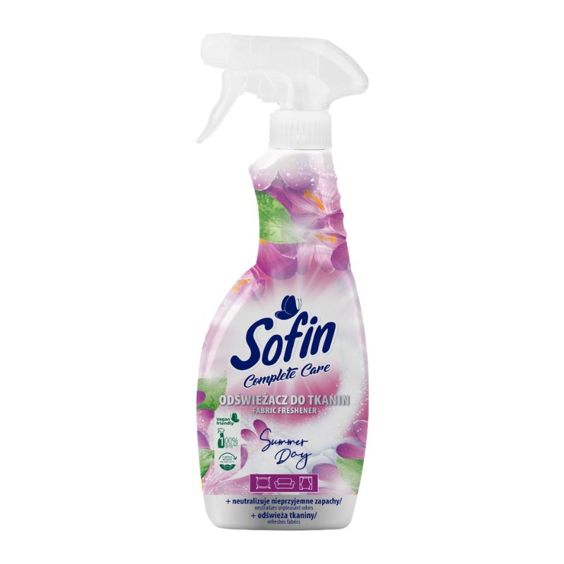 SOFIN Complete Care Fabric Freshener Summer Day 500 мл освежител за тъкани е иновативен продукт, който ефективно неутрализира неприятните миризми, оставяйки тъканите свежи и ухаещи на летен ден. Перфектен за употреба върху тапицерии, пердета, дрехи и други текстилни изделия, освежителят осигурява дълготрайна свежест и приятен аромат. Формулата на освежителя не само елиминира миризмите, но и защитава тъканите, като ги предпазва от бързо износване. Продуктът е безопасен за всички видове тъкани и не оставя петна и остатъци, което го прави идеален избор за всяко семейство, което държи на чистотата и комфорта наоколо.