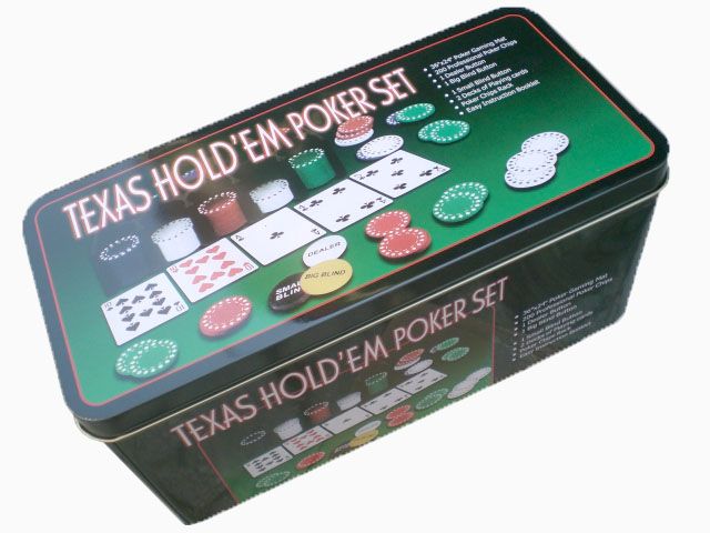 Комплектът Покер съдържа – 36″x24″ подложка за покер, 200 професионални покер чипа, дилърски бутон, голям бутон, малък бутон, две полета за карти, поставка за чиповете и книжка.