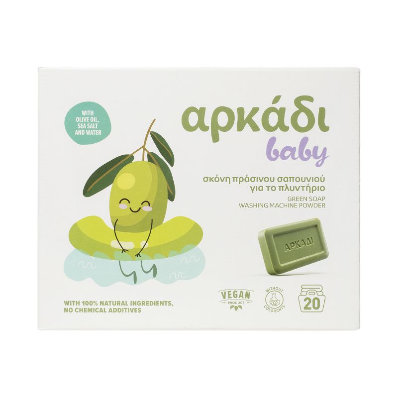 Прахът за перилни машини Arkadi Baby предлага много повече от конвенционален препарат и затова все повече съзнателни майки го избират. Благодарение на естествения си състав от зехтин, сол и вода, той е специално разработен за пералня, без течни добавки, химикали и парфюми. Идеален е за всички бебешки и бебешки дрехи, защото е 100% натурален и хипоалергенен, предпазвайки свръхчувствителната детска кожа. Формулата му е идеална за бели и цветни дрехи. Съставът му дава перфектни резултати, премахвайки най-упоритите петна, дори при ниски температури. „Arkadi“ Baby Green Powder за перилни машини е направен от гръцки зехтин от джибри и е идеален за пране с отлични резултати в райони с твърда вода. Избирайки прах за перилни машини Arkadi Baby вместо конвенционален препарат, вие не само осигурявате безупречна и чиста чистота за всички бебешки дрехи, но и подчертавате уважението си към околната среда и икономията, тъй като опаковката от 1 кг е достатъчна за повече от 20 пранета.