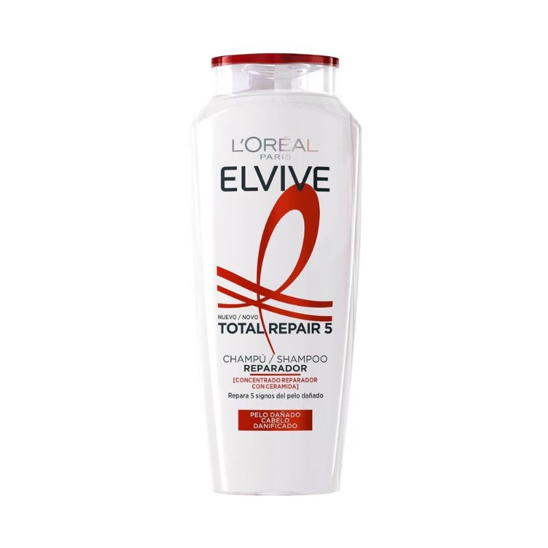 Шампоанът L’Oréal Paris Elvive Total Repair 5 почиства и възстановява увредената коса, оставяйки я по-мека на допир и по-здрава на вид. Всъщност, този шампоан се справя с пет често срещани проблема с косата с един продукт: сламена текстура, накъсване, сухота, липса на еластичност и цъфтящи краища. По този начин косата ви ще бъде забележително възстановена, копринена и с много по-здрав вид. Възстановяващата му формула е обогатена с керамиден комплекс, който незабавно съживява увредената коса. В същото време, този шампоан вътрешно възстановява всички космени влакна, оставяйки косата по-подхранена и блестяща. За допълнителна грижа използвайте балсама и маската от същата продуктова гама L’Oréal Paris Elvive Total Repair 5. В обобщение, този шампоан е идеален за тези, които искат допълнителна грижа за увредената си коса и искат да ѝ придадат повече плътност, жизненост, сила и блясък.Текстура: кремообразна; Проблеми с косата: увредена коса; Време за нанасяне: по време на вана или душ; Тип коса: всички типове коса; Основни предимства: възстановява 5 признака на увредена коса: сламена текстура, накъсване, сухота, липса на еластичност и цъфтящи краища.