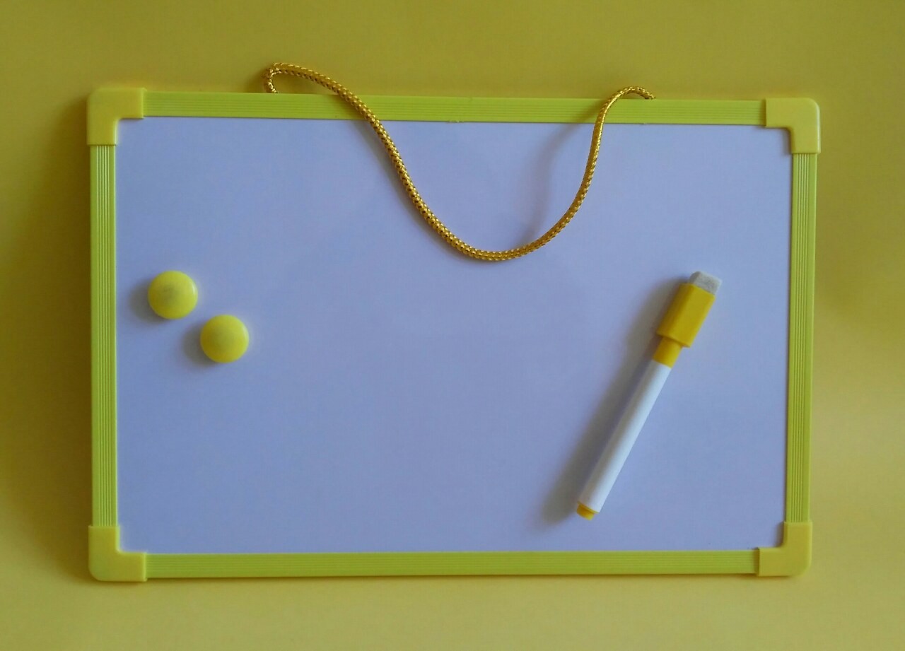 Бяла дъска за писане и рисуване с маркер и магнити – в жълт цвят.