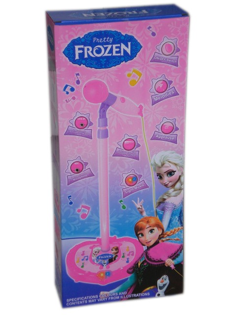 Детска играчка Микрофон на стойка Фрозен в основата си има и копче за регулиране височината на звука, светлинни ефекти, други две копчета посредством, които могат да се пускат различни мелодии. В основата има и букса за включване на МР3 -ка.