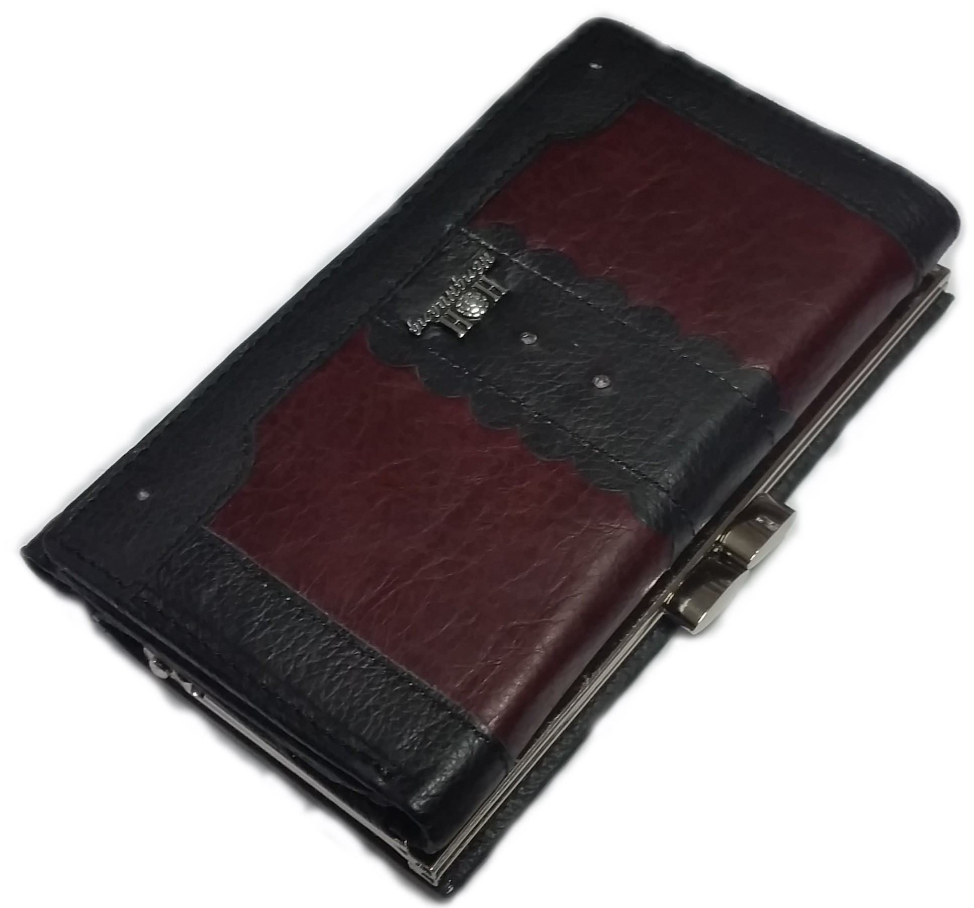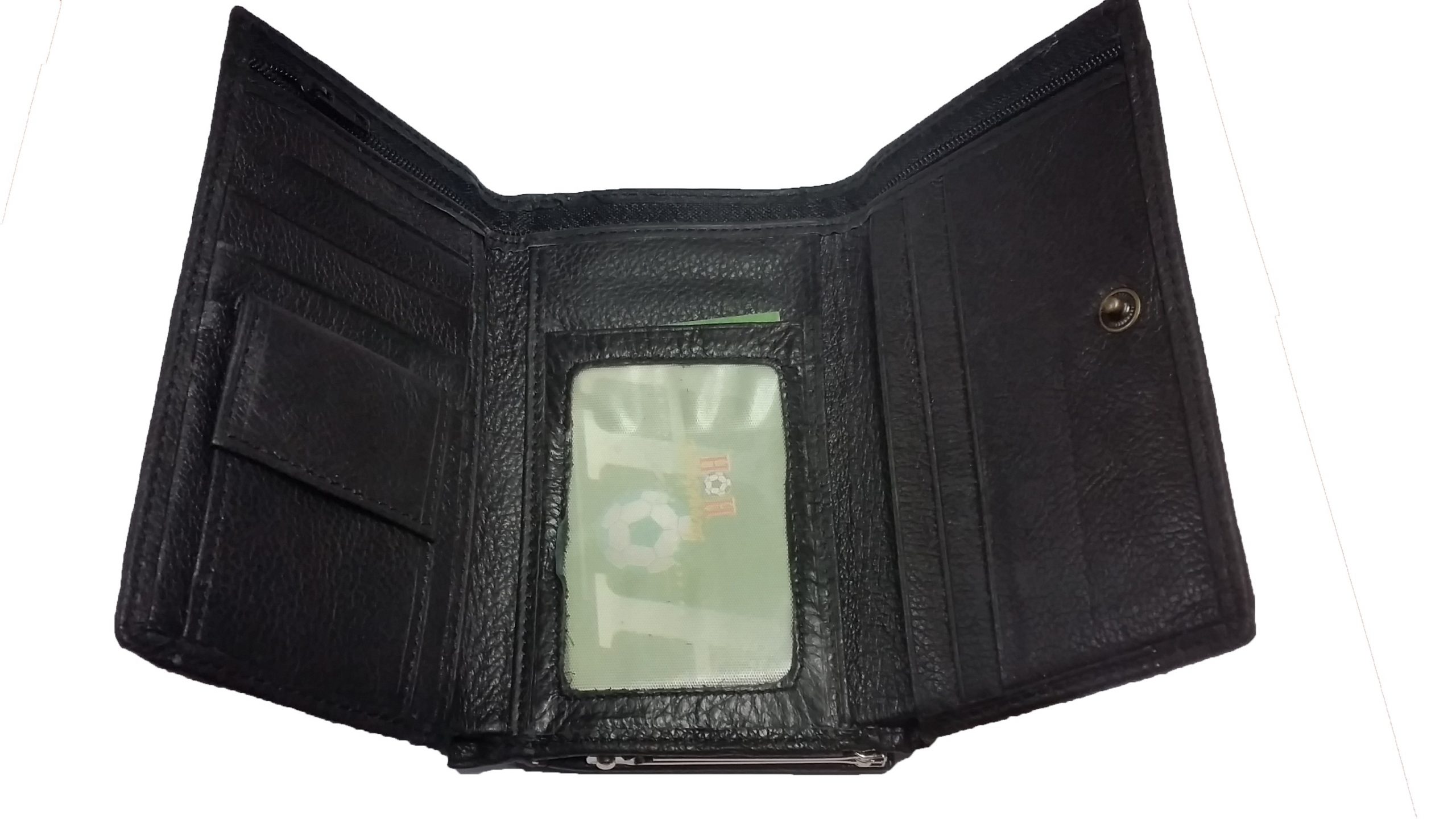 Двуцветно портмоне с естествена кожа е тройноотворяемо със външно странично отделение за монети. Вътре има място за монети с капак, място за кредитни карти и за лични документи, отдел за банкноти и отдел с цип.