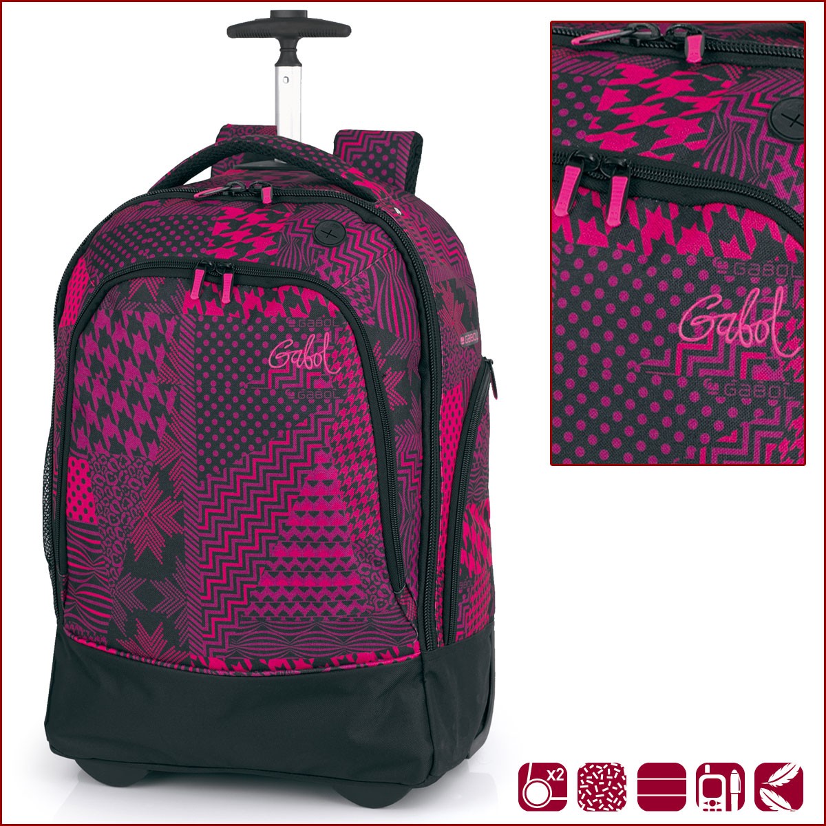 Gabol – Carry раница с колелца разполага с две основни отделения и два странични джоба с цип.