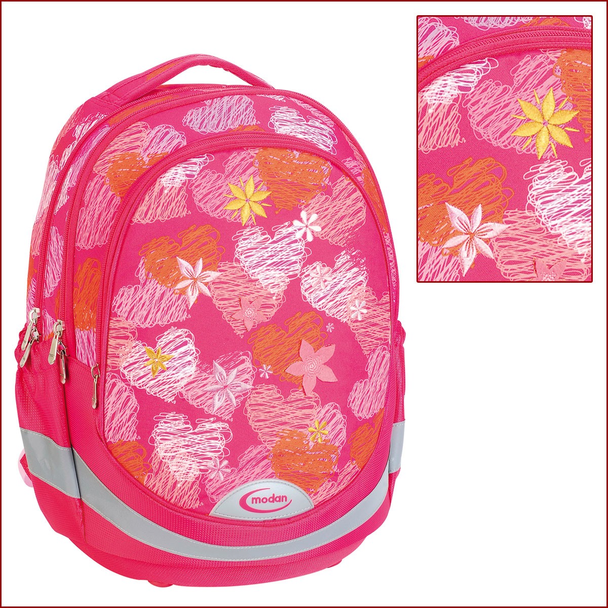 Gabol – Modan раница има твърд ергономичен гръб. Раниците са с нова патентована система, която е специално разработена за по-малките ученици. Системата следва анатомичното очертание на гърба на детето и дава перфектна опора на гърба. Ергономичният гръб на Gabol – Modan раница предпазва децата от гръбначни изкривявания.Gabol – Modan раница разполага с две основни отделения, голям преден джоб и два странични джоба. Раницата има регулируеми презрамки и ципове с метални водачи.