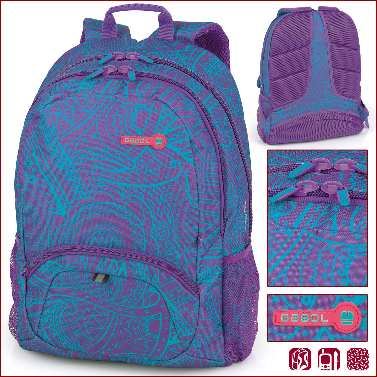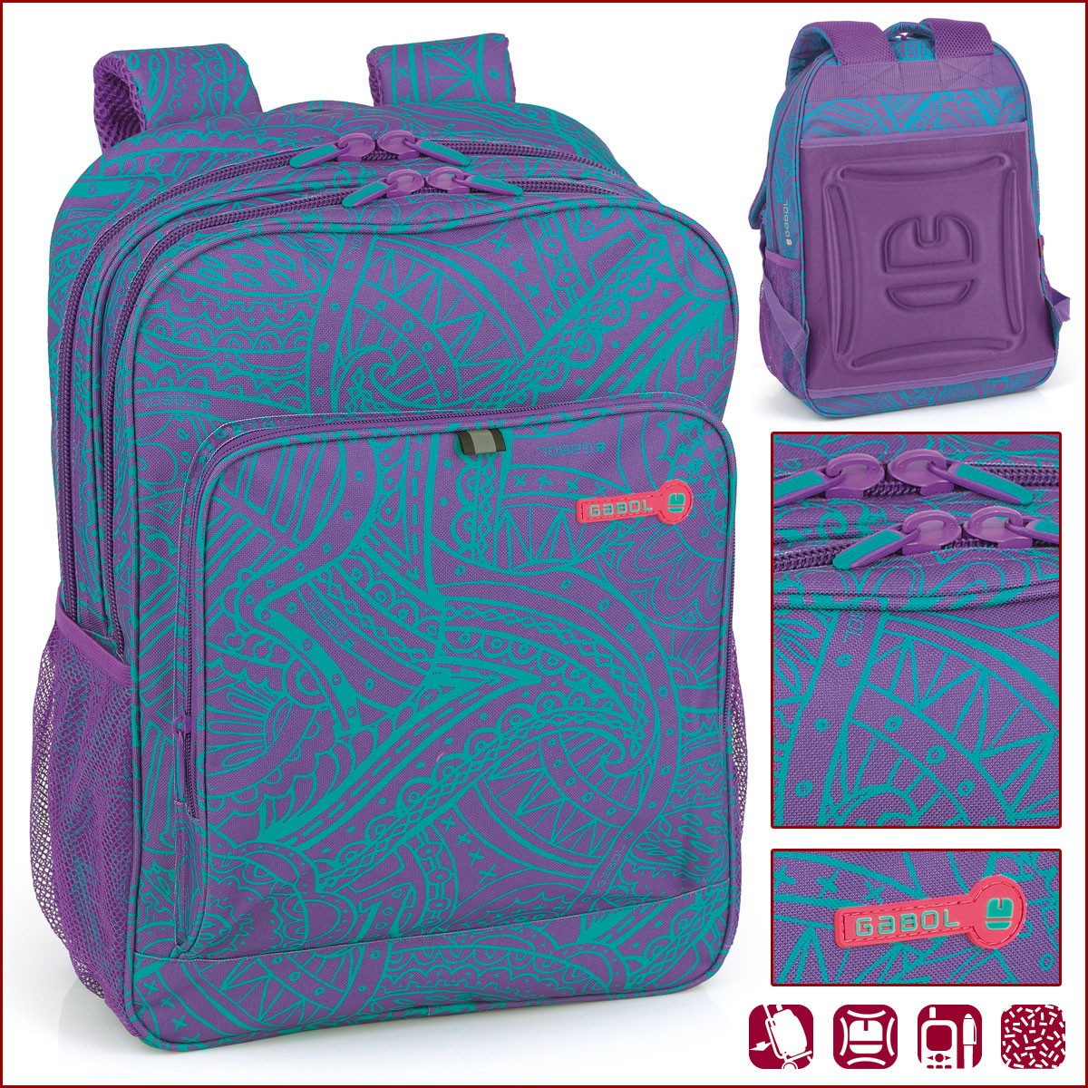 Gabol – Ping раница разполага с две основни отделения и един преден джоб. Gabol – Ping раница има регулируеми презрамки, както и странични джобове за бутилка.Раницата има термоформ гръб, който я прави изключително удобна, и също така тя разполага и със система за закрепянето й върху количка.