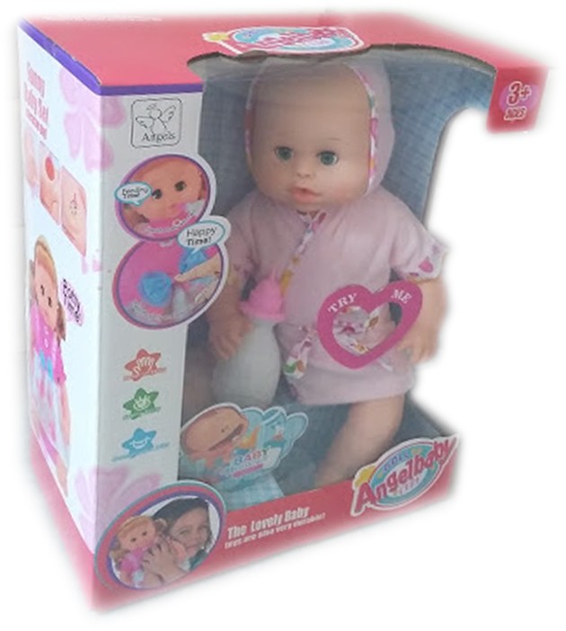 Куклата бебе The Lovely Baby е много сладка. Тя е в комплект с мляко, памперс и други аксесоари. Освен това, тя може да издава звуци и да мига с очичките си.