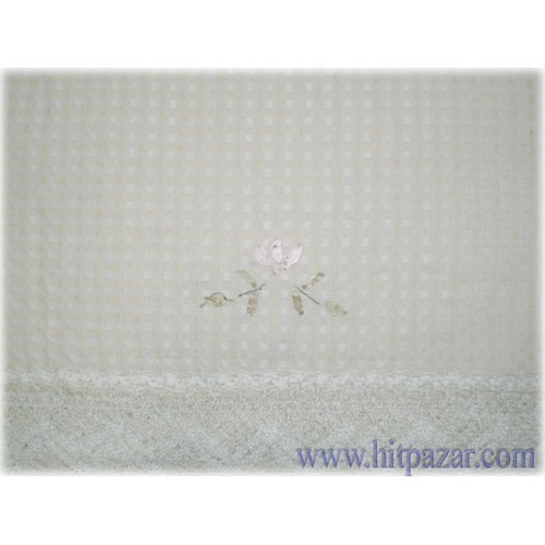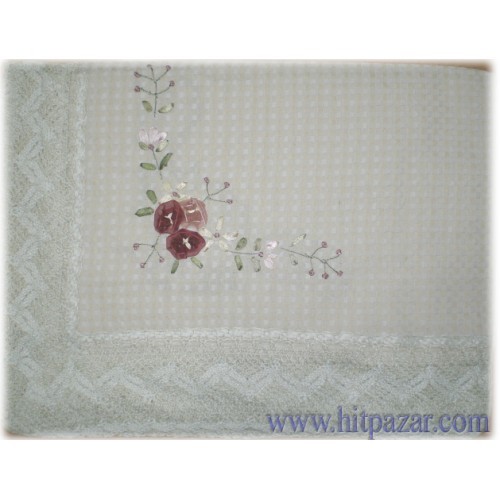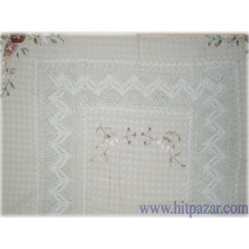 Цвят – нюанс на екрю. Материя подобна на лен. По краищата и в средата покривката за маса е декорирана с дантела и релефни, втъкани цветя.