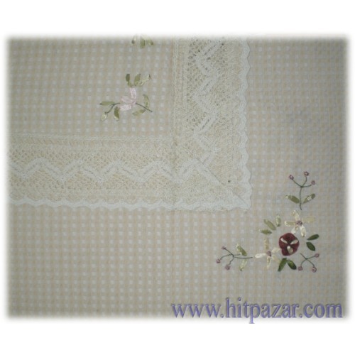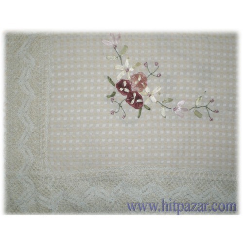 Цвят – нюанс на екрю. Материя подобна на лен. По краищата и в средата покривката за маса е декорирана с дантела и релефни, втъкани цветя.