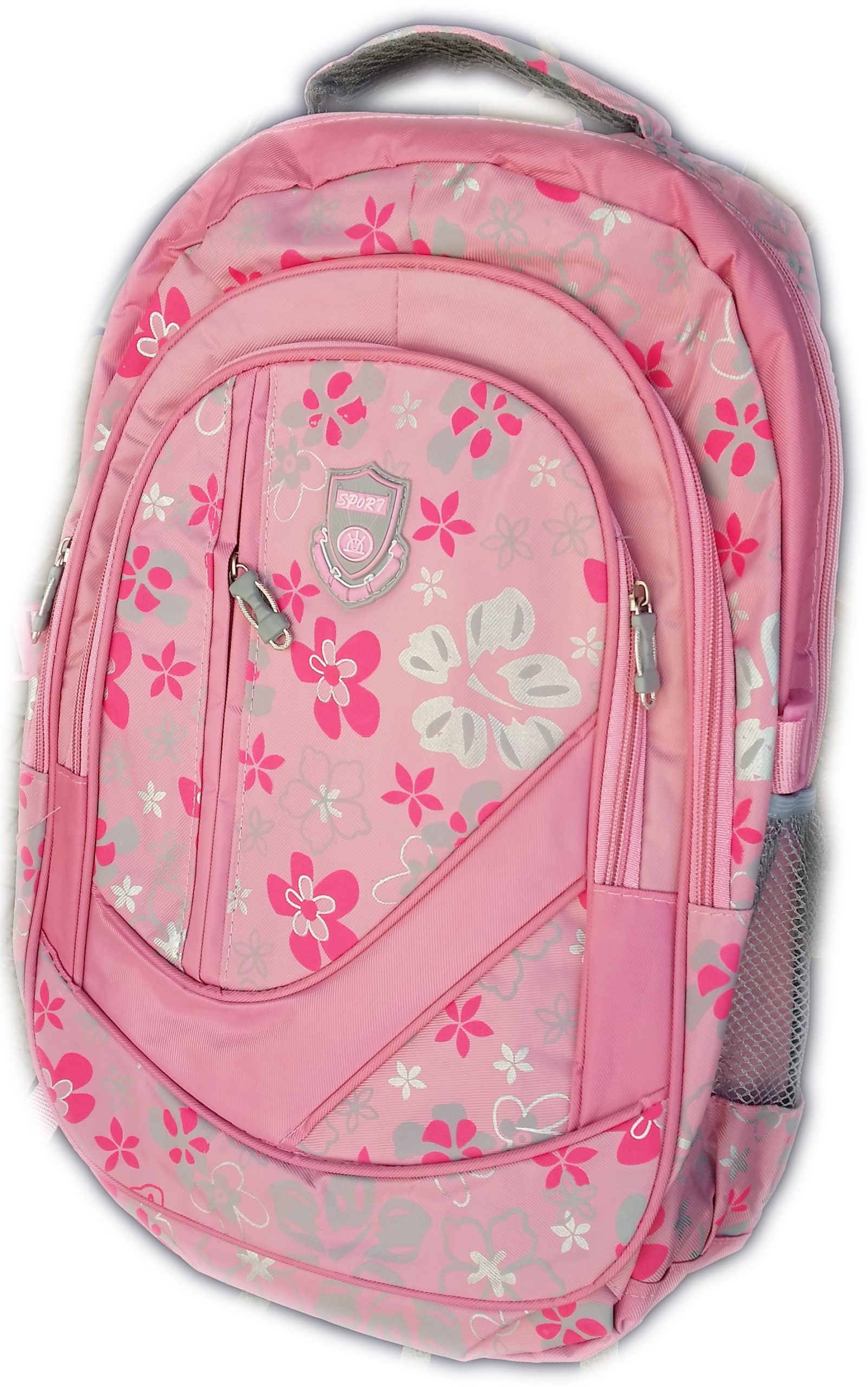 Ученическата раница за момичета в розово с цветя разполага с един голям раздел, един по-малък пред него и още два отпред. Два странични джоба, мек гръб и удебелени презрамки.